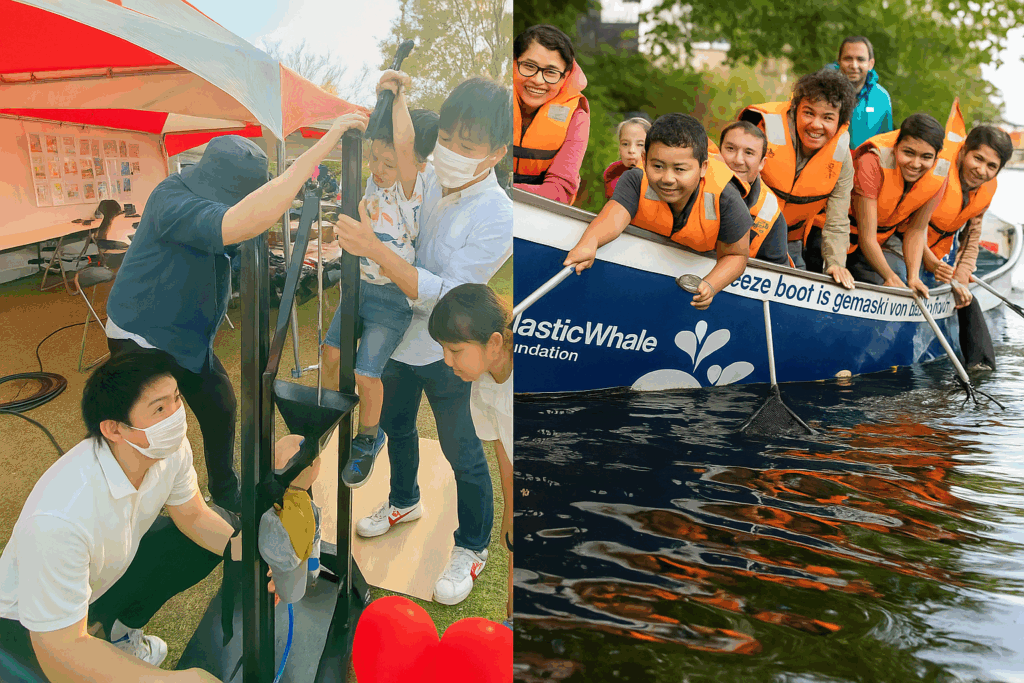 参加者は小さな船に乗り込み、宮島の風景を楽しみながら海上のプラスチックゴミを大きな網で収集。参加者同士で拾ったゴミの量を競ったり、ゴミの品評会をしながらゲーム感覚でゴミ拾いを楽しみます。また、ツアーの途中で、ガイドから海ごみ(プラスチックゴミ)の現状や、リサイクルの現状についてレクチャーを受け、海洋問題に関する知識を深めることができます。ツアー終了時には、参加者には海洋ごみからアップサイクルされた小さな記念品が贈られます。